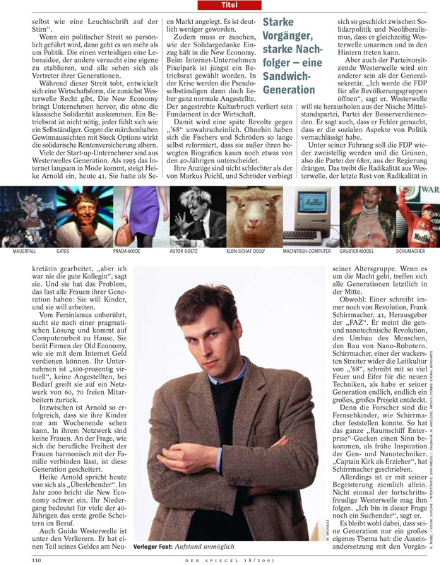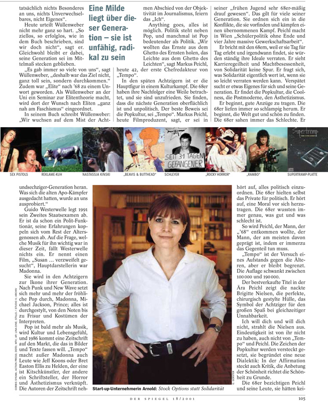 (...) Als 1995 das Internet langsam in Mode kommt, steigt Heike Arnold ein, heute 41. Sie hatte als Sekretärin gearbeitet, "aber ich war nie die gute Kollegin", sagt sie. Und sie hat das Problem, das fast alle Frauen ihrer Generation haben: Sie will Kinder, und sie will arbeiten. Vom Feminismus unberührt, sucht sie nach einer pragmatischen Lösung und kommt auf Computerarbeit zu Hause. Sie berät Firmen der Old Economy, wie sie mit dem Internet Geld verdienen können. Ihr Unternehmen ist "100-prozentig virtuell", keine Angestellten, bei Bedarf greift sie auf ein Netzwerk von 60, 70 freien Mitarbeitern zurück. Inzwischen ist Arnold so erfolgreich, dass sie ihre Kinder nur am Wochenende sehen kann. In ihrem Netzwerk sind keine Frauen. An der Frage, wie sich die berufliche Freiheit der Frauen harmonisch mit der Familie verbinden lässt, ist diese Generation gescheitert. Heike Arnold spricht heute von sich als "Überlebender". (...)