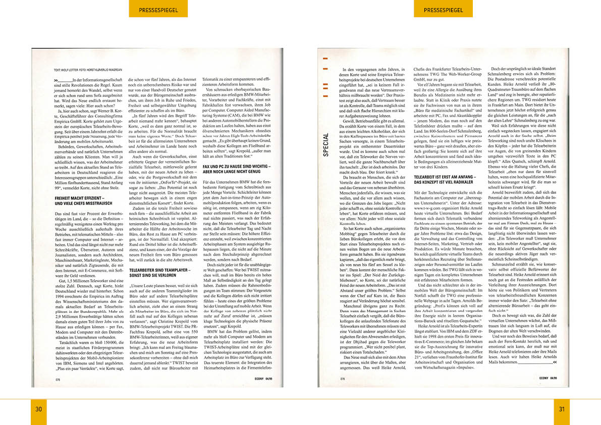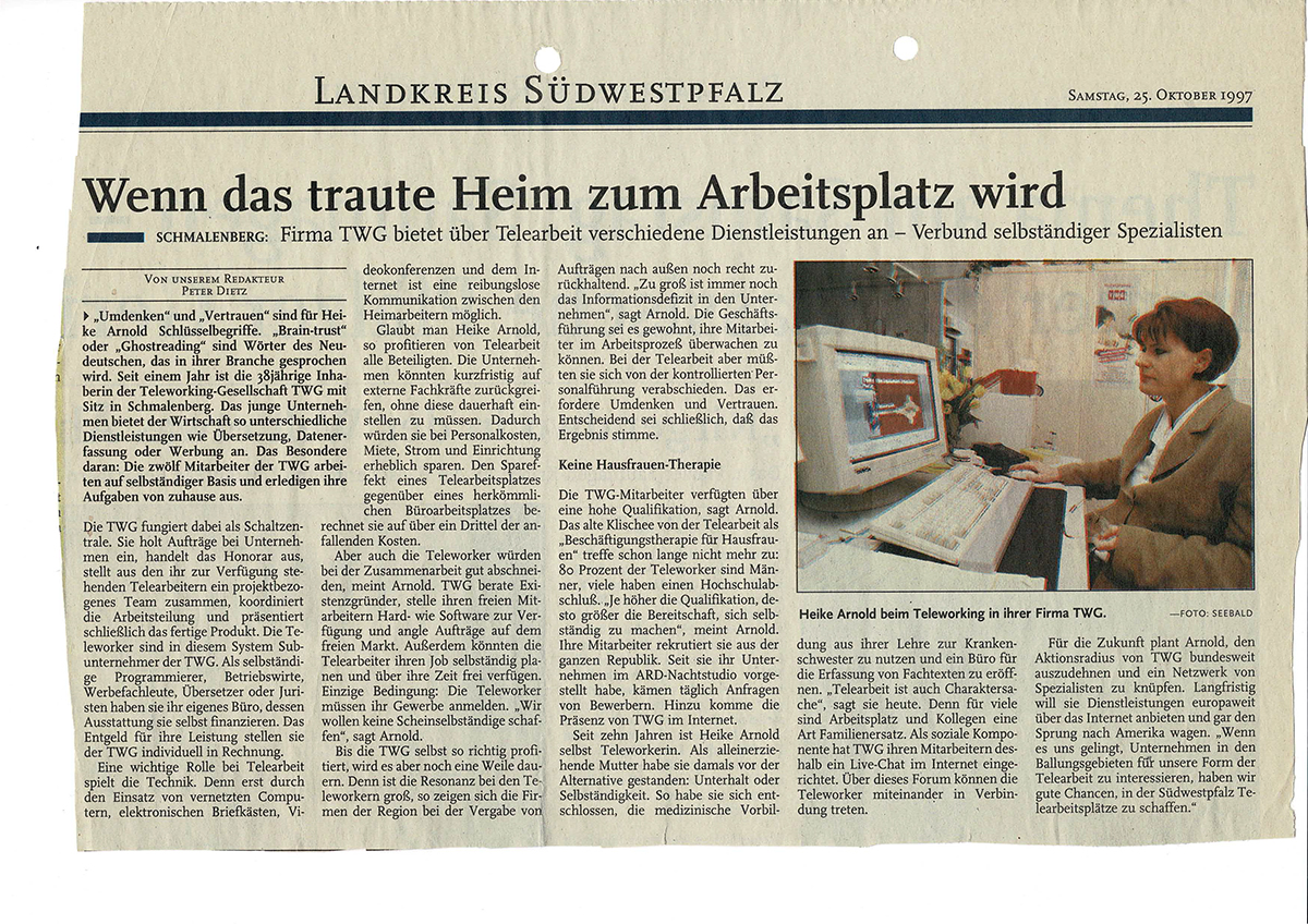 (...) "Umdenken" und "Vertrauen" sind für Heike Arnold Schlüsselbegriffe. "Brain-trust" oder "Ghostreading" sind Wörter des Neudeutschen, das in ihrer Branche gesprochen wird. Seit einem Jahr ist die 38jährige Inhaberin der Teleworking-Gesellschaft TWG mit Sitz in Schmalenberg. Das junge Unternehmen bietet der Wirtschaft so unterschiedliche Dienstleistungen wie Übersetzung, Datenerfassung oder Werbung an. Das Besondere daran: Die zwölf Mitarbeiter der TWG arbeiten auf selbständiger Basis und erledigen ihre Aufgaben von zuhause aus. (...)