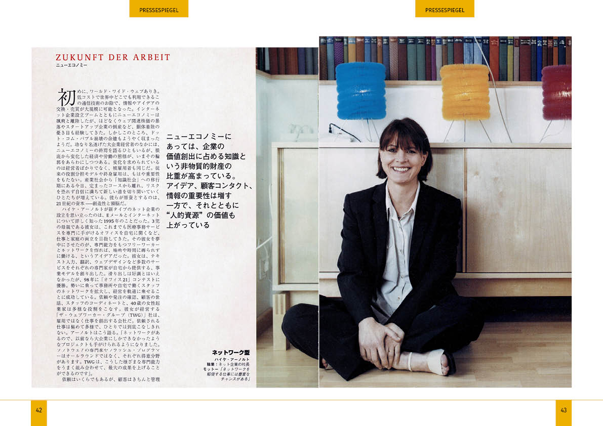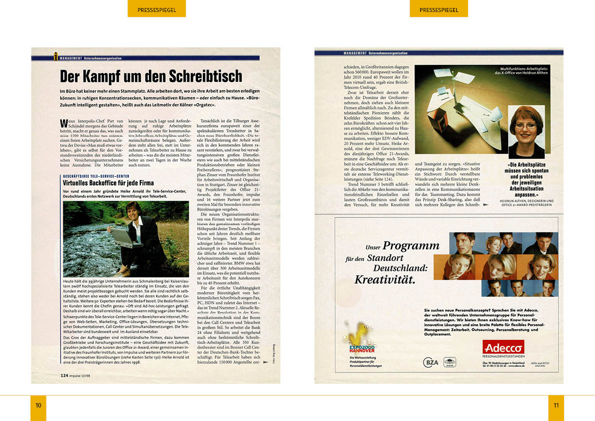 (...) In Heike Arnolds Kopf setzte sich die Idee eines neuartigen virtuellen Unternehmens fest, als sie 1995 erstmals von E-Mail und Internet hörte. Die Vorstellung faszinierte sie, unabhängig von Orten und Zeiten arbeiten zu können und ein Netzwerk mit anderen kompetenten Freiberuflern aufzubauen. Arnold entwickelte ein Geschäftsmodell, das es ermöglichen sollte, zahlreiche Dienstleistungen von zu Hause aus zu erledigen.