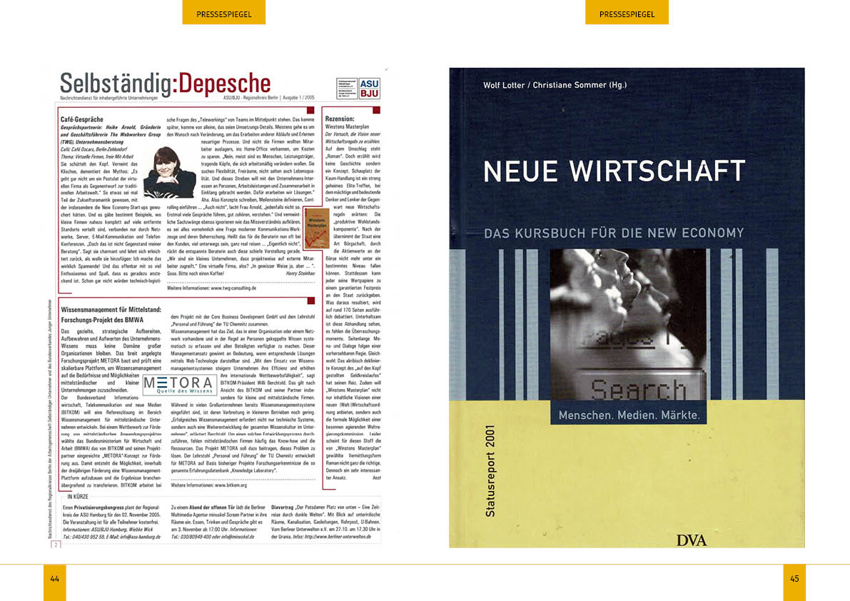 (...) Um als Mikrounternehmen auch an größere Projekte heranzukommen, schließen sich immer mehr Selbständige zu Teams zusammen. Bei der Software-Entwicklung und in der Multimedia-Branche ist dieser Trend am stärksten. Die Firma The Webworker Group, kurz TWG, hat kein Bürogebäude und keine Angstellten, ihre Adresse findet sich nur im Internet. Die Mitarbeiter von TWG - Designer, Übersetzer, Werbefachleute und Web-Site-Bastler sitzen in Frankfurt, Mannheim und Kalifornien.